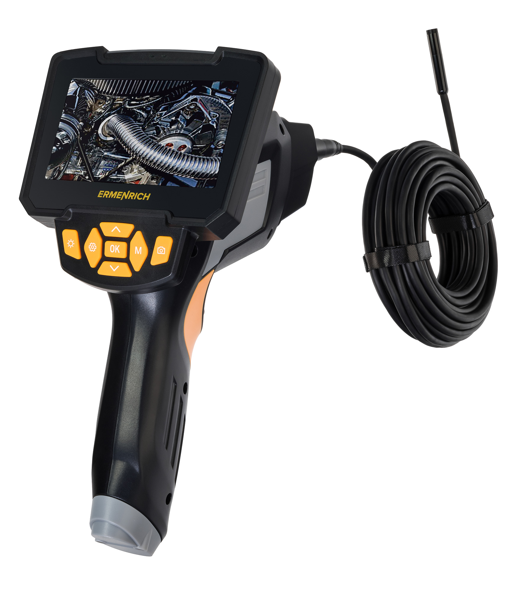 Boroskop Ermenrich Seek VE70 jest wyposażony w dwie kamery HD umożliwiające prowadzenie dokładnych inspekcji wąskich i trudno dostępnych miejsc. Kamera jest zamontowana na 10 metrowym elastycznym przewodzie umożliwiający dotarcie do odległych miejsc, a oświetlenie LED ułatwia pracę w warunkach słabego oświetlenia. Kamera inspekcyjna służy do sprawdzania rur kanalizacyjnych, przestrzeni w ścianach, samochodów ciężarowych, urządzeń domowych, silników, turbin itp. Urządzenie jest przydatne zarówno dla majsterkowiczów, jak i profesjonalistów.
