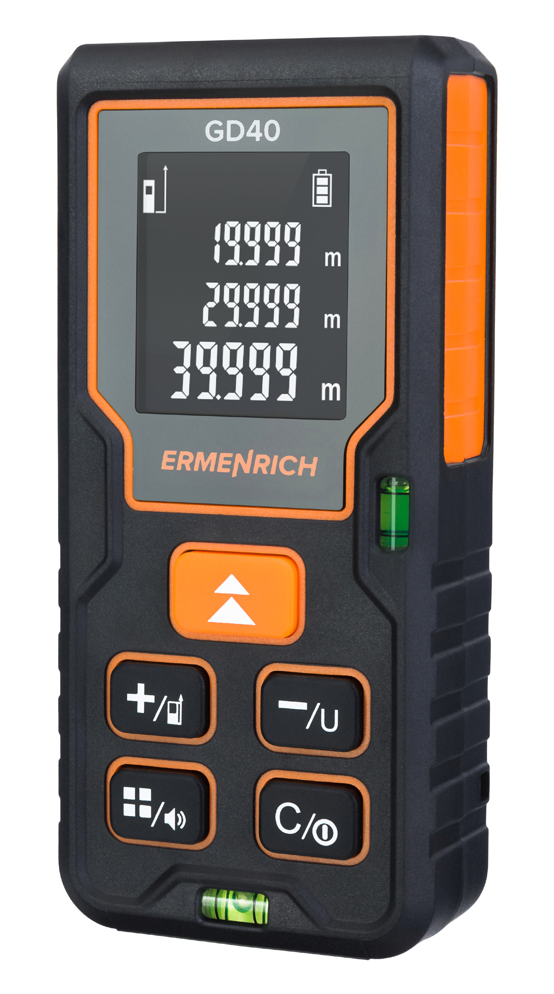 Dalmierz laserowy Ermenrich Reel PLUS GD40 to przyrząd do wykonywania różnych pomiarów w małych i średnich pomieszczeniach. To uniwersalne urządzenie może być stosowane do prac budowlanych, remontowych, dekoracji wnętrz, produkcji, montażu oraz wielu innych zastosowań. Maksymalna odległość wykonywania pomiaru wynosi 40 metrów. Oprócz pojedynczych pomiarów odległości, dalmierz laserowy może mierzyć powierzchnię i objętość w trybie pomiaru ciągłego.