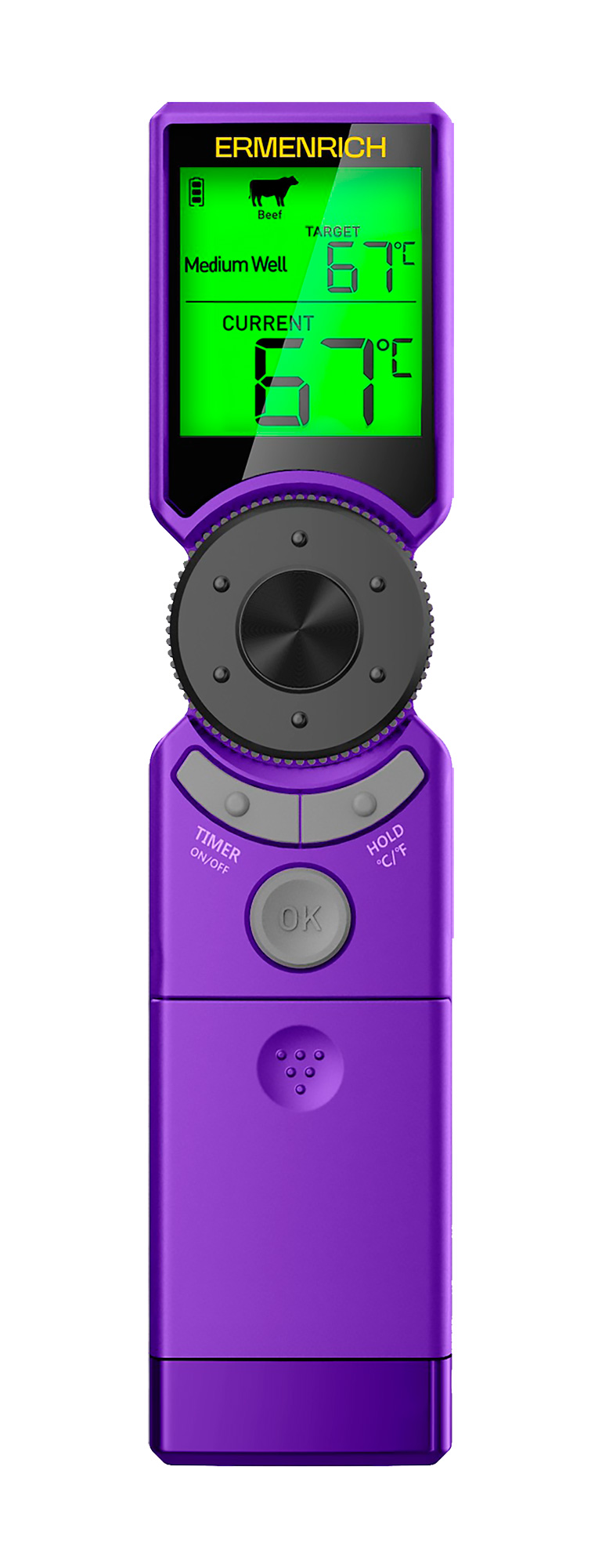 Poznaj model Ermenrich BBQ GT10 – nowego inteligentnego pomocnika w kuchni. Z tym termometrem każde mięso – soczysty kurczak, chudy indyk, stek wołowy czy soczysta jagnięcina – będzie przygotowane dokładnie tak, jak chcesz. Termometr ma wstępnie ustawione programy dla najpopularniejszych rodzajów mięsa i automatycznie sugeruje idealną temperaturę docelową i czas gotowania, które pozwolą uzyskać do